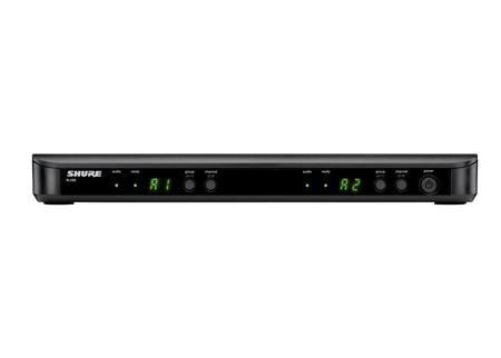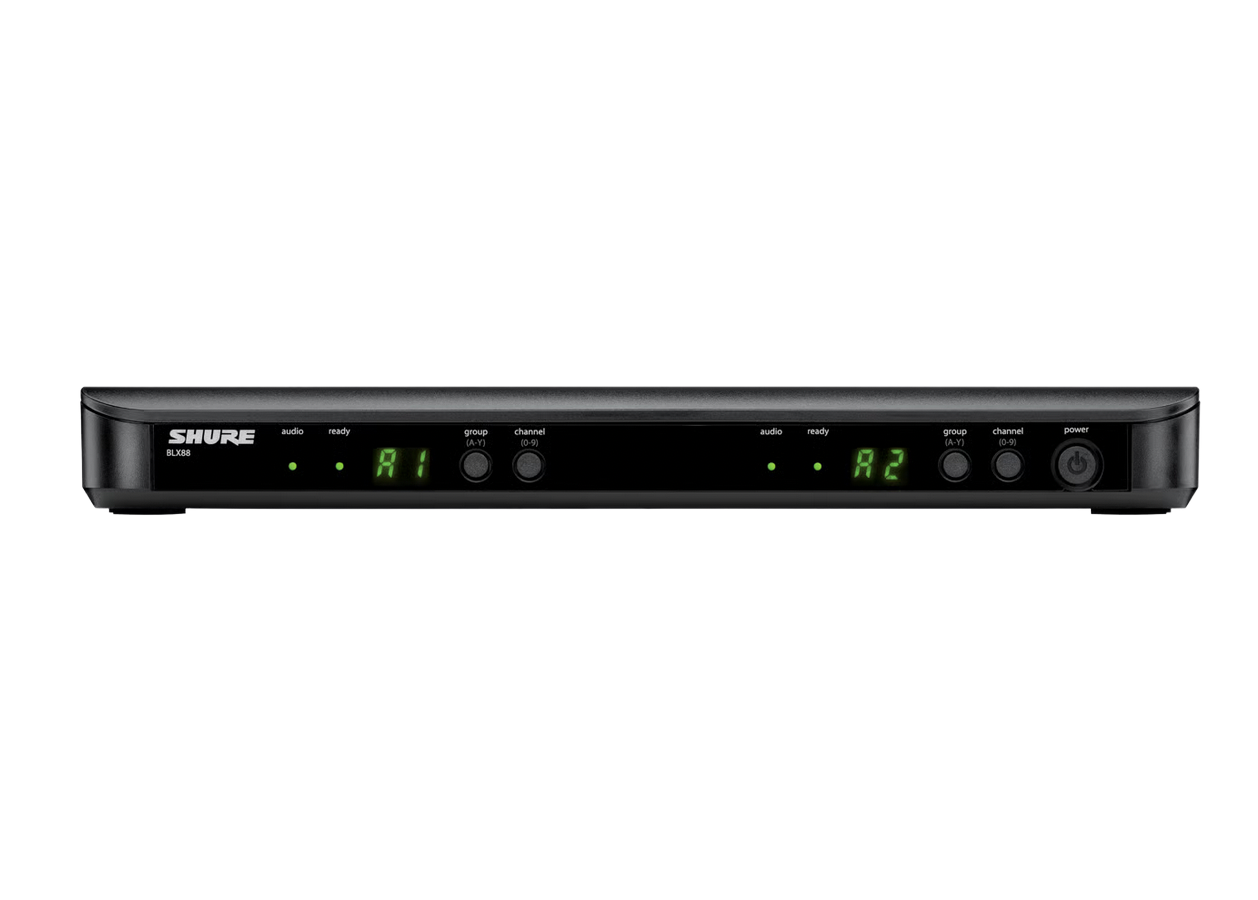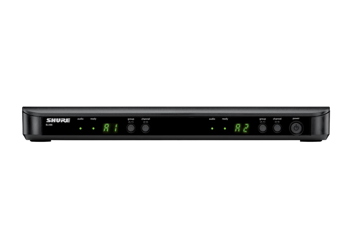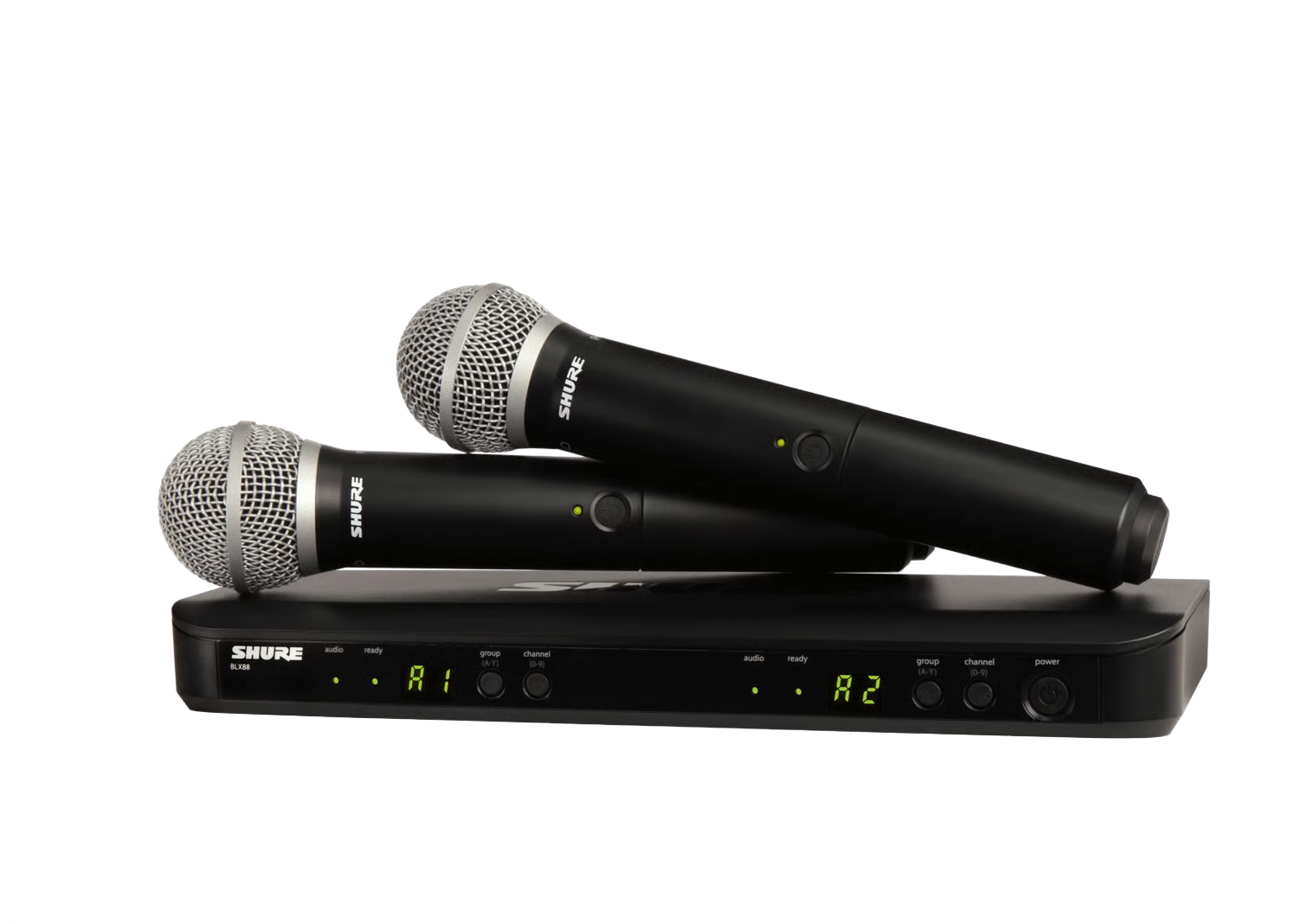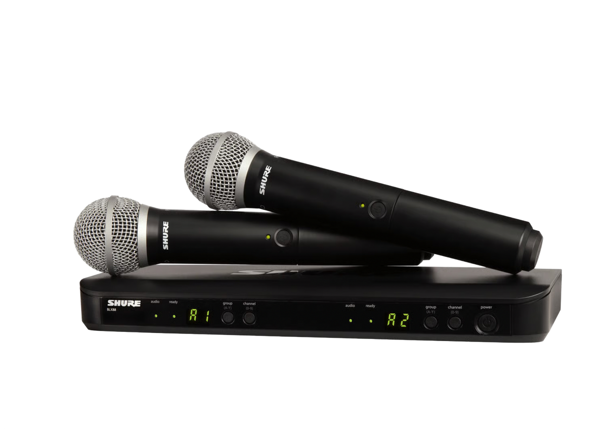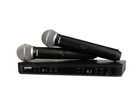 The Shure BLX288/PG58 Wireless Dual Vocal System combines professional-quality sound with simple setup and up to 14 hours battery life for great audio performance for two vocalists right out of the box. The system includes BLX88 tabletop dual-channel receiver, 2 PG58 handheld transmitters, 2 microphone clips, power supply, 2 AA batteries, and user guide.